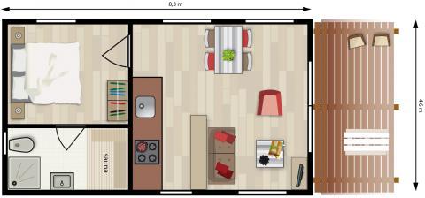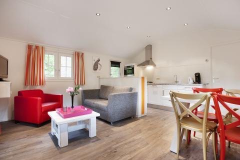 Vrijstaand en rookvrij. Opp. ca.38m2. Woonkamer met zit- en eethoek, LCD TV, DVD- en CD-speler. Open keuken met combi-magnetron, filter en Senseo koffiezetapparaat, vaatwasser, waterkoker, 4-pits gasstel en koelkast. Badkamer met wastafel, douche, toilet en sauna. Eén slaapkamer met een 2-persoonsbed (bijplaatsen van een kinderbedje is niet mogelijk in de slaapkamer). Veranda met tuinmeubilair. Deze accommodaties beschikken over een oplaadpunt voor een elektrische fiets. WiFi is tegen betaling.