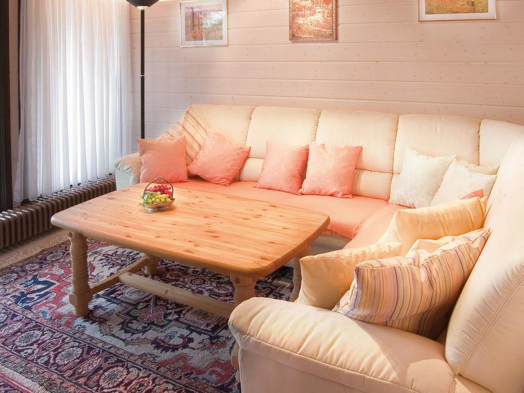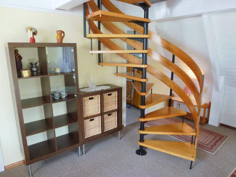 Huis 3-kamers 68 m2 op 2 verdiepingen, op de begane grond. Gedeeltelijk afgeschuinde daken: woon-/eetkamer met Kabel-TV. Open keuken (oven, elektrische koffiemachine). Douche/WC. Zolderverdieping: (wenteltrap), 1 kamer met afgeschuinde daken met 3 bedden. 1 2-pers. kamer met afgeschuinde daken. Terras. Terrasmeubelen. Ter beschikking: kinderstoel. Let op: rookvrij huis. Maximaal 1 huisdier/hond toegestaan. Houten huizen met puntdak tot aan de grond. Baby's of peuters boeken als 7e persoon is NIET mogelijk.
