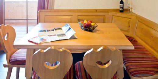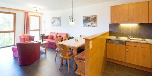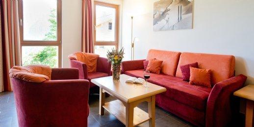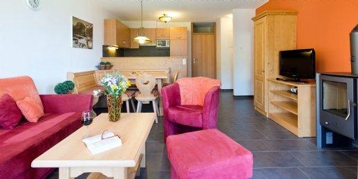 Comfortabele appartementen. Woonkamer met zit- en eethoek, vloerverwarming, tv en houtkachel (een aantal met gelhaarden). Open keuken met magnetron en afwasmachine. Balkon of terras. Een gemeenschappelijke skikelder per appartementengebouw. De appartementen liggen op drie etages en zijn door middel van een trappenhuis met elkaar verbonden (een lift is enkel in het hoofdgebouw). Een parkeerplaats in de garage per appartement.