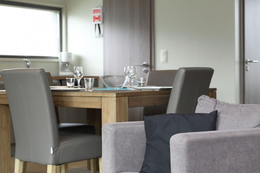 Parterre Gang Open keuken waterkoker, fornuis (4 kookplaten, elektrisch), koffiezetapparaat (pads), oven, magnetron, afwasmachine, koelkast (+ vriesvak) Woon/eetkamer TV (flatscreen), eettafel (4 personen) Bijkeuken strijkplank, strijkijzer Op de 1e etage Slaapkamer 2-pers.king size bed (2 persoons dekbed, 180 x 200 cm) Slaapkamer 2x 1-pers. bed Badkamer douche, haardroger Toilet Algemeen Terras (15 m2)